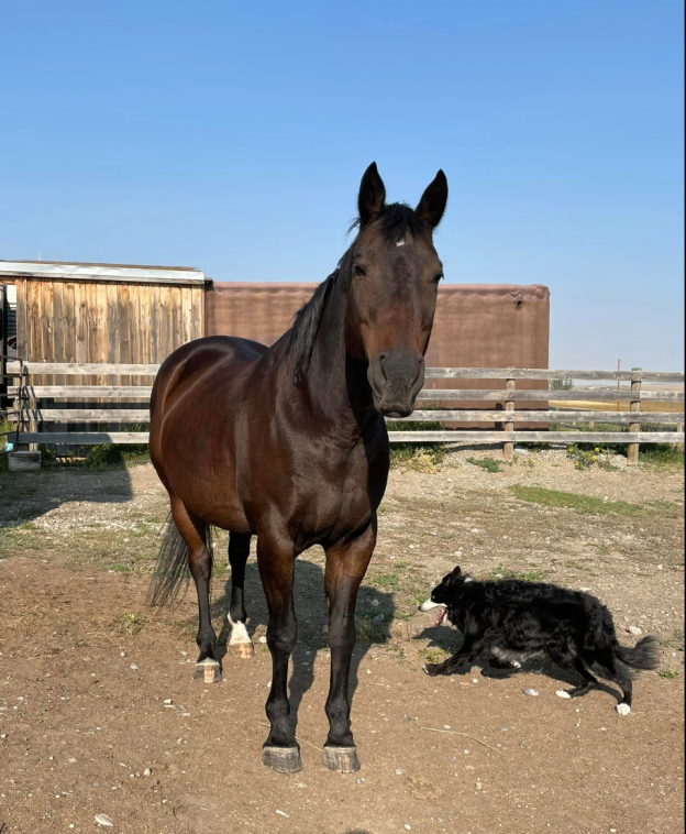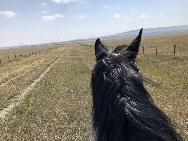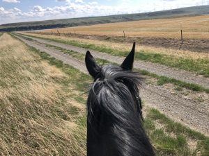 It was hot and sunny today. I rode my bike out to Mac. Amanda was playing outside with her baby. We talked while I got Mac. Groomed him and tacked him up. He didn’t like the saddle being put on. Fair enough. When I brought him out of the paddock, Amanda put her baby in the saddle. He was smiling, happy to be on a horse. His legs were too short for the stirrups, even when they were rolled up. The baby smiled, and then he cried when she took him down. He liked the horse. I got on Mac and rode out to the edge of the property, where the round-pen will someday be. We walked around. He was better at being alone. He trotted and I let him, tried to keep a rhythm. He seemed a bit stiff, I hoped he was sound.  Then he cantered, and I grabbed mane. It was fun. Simple as it was. The ground there is uneven. Here we are in the country. I, riding a western horse, in dressage tack, and cowgirl boots, with sunglasses and no helmet. A mix of both worlds, English and western, so different from where I came from, to here, the foothills of Alberta. I realized then, that at that moment I was living my childhood dream, that this was it, riding a horse with no rules, in the wide open- God’s Country.